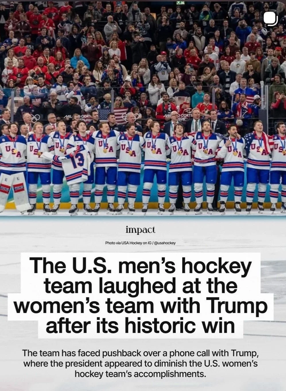 I often repost political posts on my Instagram story. For my engagement portfolio I focused on the recent event surrounding the US men’s hockey team. After the 2-1 win over Canada in the 2026 Olympic games, the US men’s hockey team is seen on a call with President Trump. A snarky and sexist remark is made by Trump stating that he’d probably be impeached if he didn’t also invite the US women’s hockey team. Obviously blatant sexism, the men laughed in agreement and have yet to publicly apologize, (though it’s stated they have sent a private apology). Hilary Knight, captain of the Olympic gold medalist women’s hockey team, stated in an interview, “It’s a great teaching point to really shine light on how women should be championed for their amazing feats. And now I have to sit in front of you and explain someone else’s behavior. It’s not my responsibility.” It is also important to state the US women’s hockey teams victory at the 2026 Olympic Winter Games. Since 1998, they have medaled in every Olympics with their most recent gold in 2018. On the other hand, the men hadn’t medaled since 2010 when they received silver. Before 2026, their most recent gold medal in ice hockey was 1980, 46 years ago. Furthermore, 63.6% of Team USA’s medals were won by women. Eight of the twelve golds were also won by women. It is evident that the women were instrumental in team USA’s Olympic success. And yet their achievements have been overshadowed by the men’s blatant ignorance. I received likes by those who agreed and this topic has come up in conversation with my friends and family who have a similar outlook.