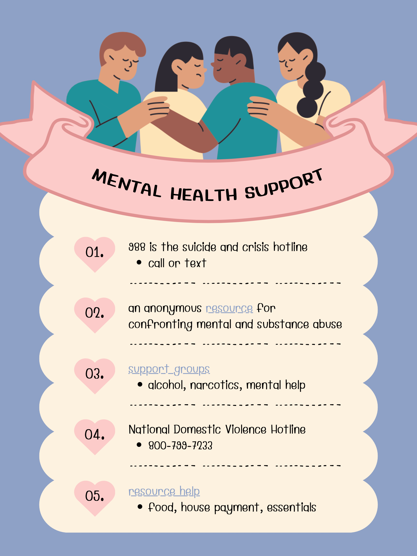 I created a mental health support flyer for those who may not know where to find resources. As I have struggled with my mental health, it is important to me that I spread awareness for those in need of support. At the top I included the suicide and crisis hotline. As a subscript, I noted that the number is available to text or call. This is especially helpful for those who are anxious to call. Furthermore, women are at high risk of domestic violence. Because of their heightened vulnerability, the National Domestic Violence Hotline was necessary to highlight. Anonymous resources were also included as many do not feel comfortable reaching out if their identity is known. Doing so eliminates the perceived stigma one may have regarding others beliefs about them. Those in need of support are less likely to seek it out if they feel judged by those around them. Another resource provided via link are support groups. Many times those struggling need to converse with those experiencing similar struggles. Doing so shows them that they’re not alone. Lastly, I linked the website that can help people in need of essential help. There are resources for so much, but people can begin to think they’re alone if these resources are unknown to them.
